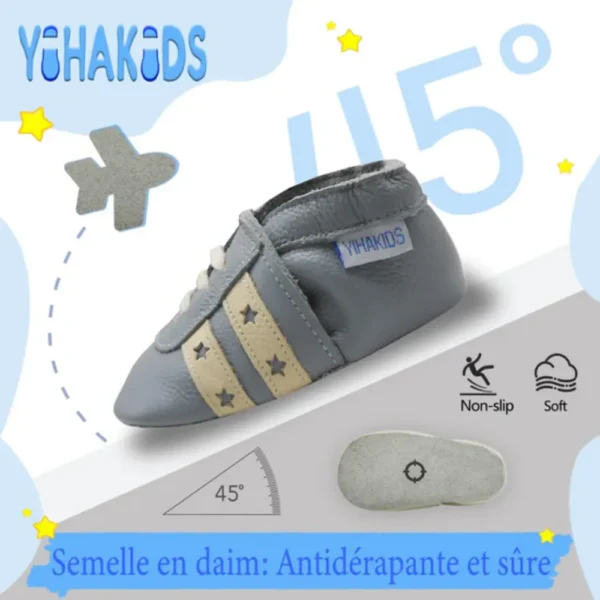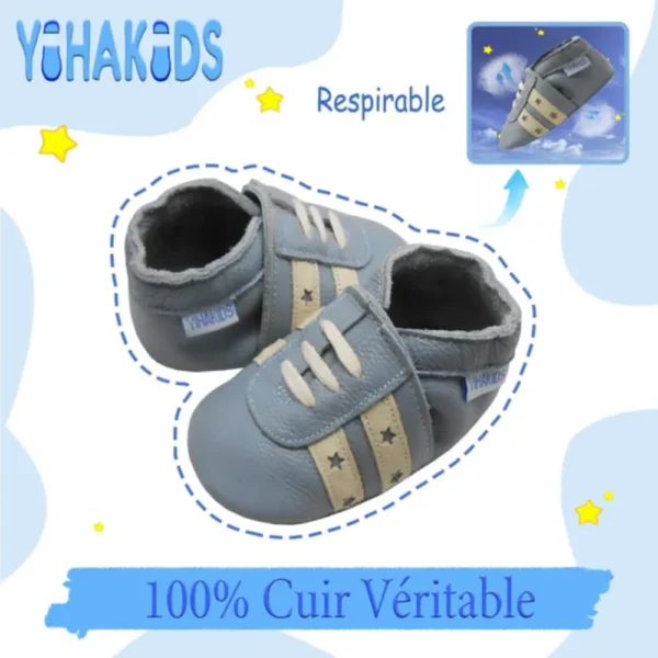 - Offrez confort et sécurité aux petits pieds avec les chaussons en cuir pour bébé. Conçus pour les enfants de pointure 21-22 (12-18 mois), ils assurent une tenue parfaite et une liberté de mouvement optimale.
