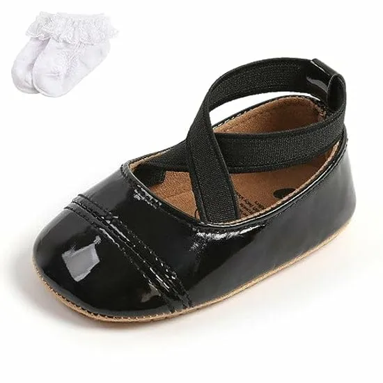 Chaussures antidérapantes pour bébé fille 6-12 mois – Noires et brillantes avec chaussettes blanches incluses