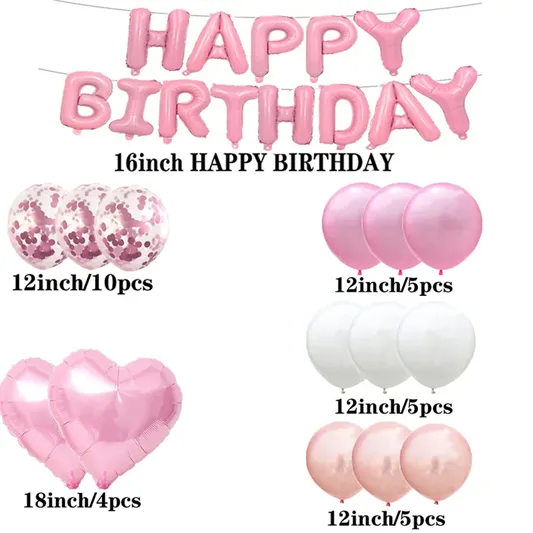 Le pack comprend de grands ballons chiffres « 23 » en aluminium Mylar rose de 40 pouces, une bannière « Happy Birthday » composée de lettres de 16 pouces, ainsi que 4 ballons en forme de cœur en Mylar de 18 pouces. Il inclut également des ballons en latex assortis : 5 ballons rose doré, 5 ballons roses et 5 ballons blancs, parfaits pour compléter la décoration et créer un bel équilibre de couleurs.